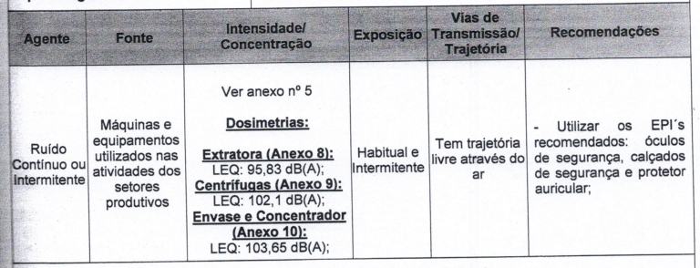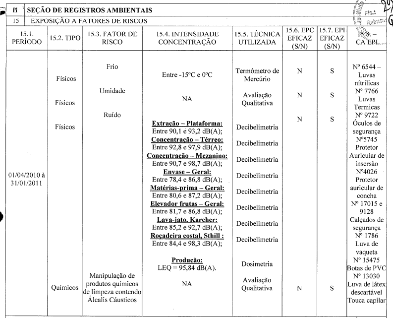 Na empresa Refama o PPP do p.10, indica para o autor atividades muito similares às dos vínculos anteriores ("Operar e/ou auxiliar na operação das máquinas e equipamentos utilizados na produção de sucos e óleos essenciais. Armazenar tambores com produtos prontos nas câmaras frias. Limpar e higienizar máquinas e equipamentos do setor de produção.") e, relativamente à exposição a agentes, prova o seguinte (p.11):