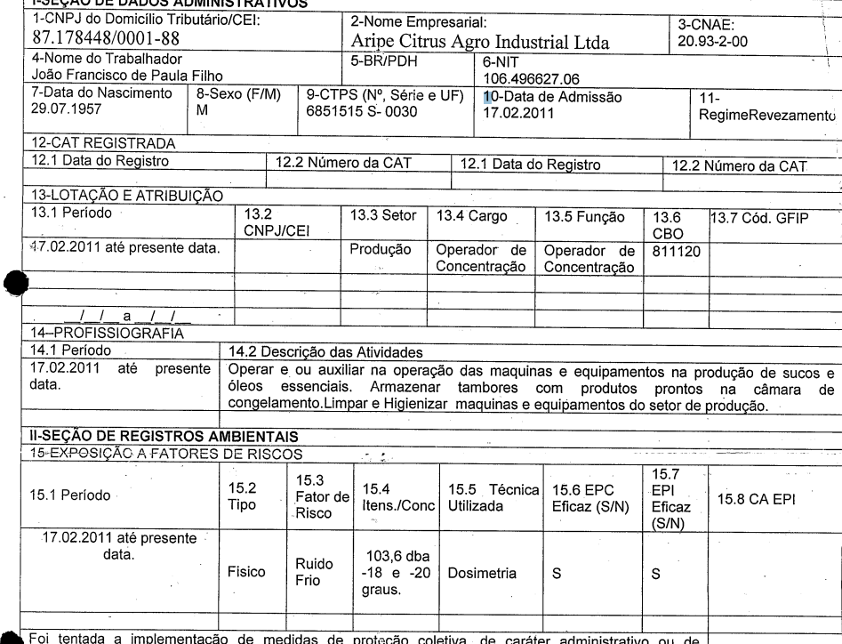 Provas: | CTPS: evento 1, PROCADM6, p. 3 Formulário: evento 1, PROCADM6, p. 13 Laudo técnico da empresa: evento 36, OUT2 |