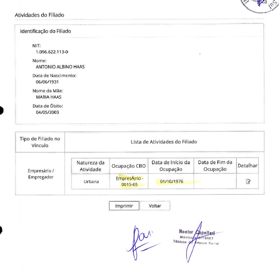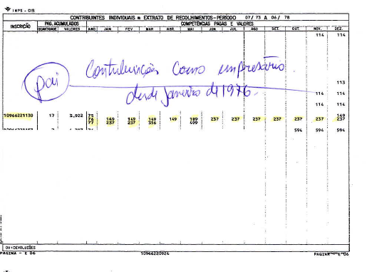 Da análise da documentação, verifica-se que os documentos apresentados a fim de comprovar o labor rural no intervalo estão em nome do genitor do autor, Sr. Antônio Albino Haas. No entanto, consta que o pai do demandante possui inscrição como empresário dessde 01/10/1976, recolhendo contribuiçoes desde janeiro de 1976, vejamos: