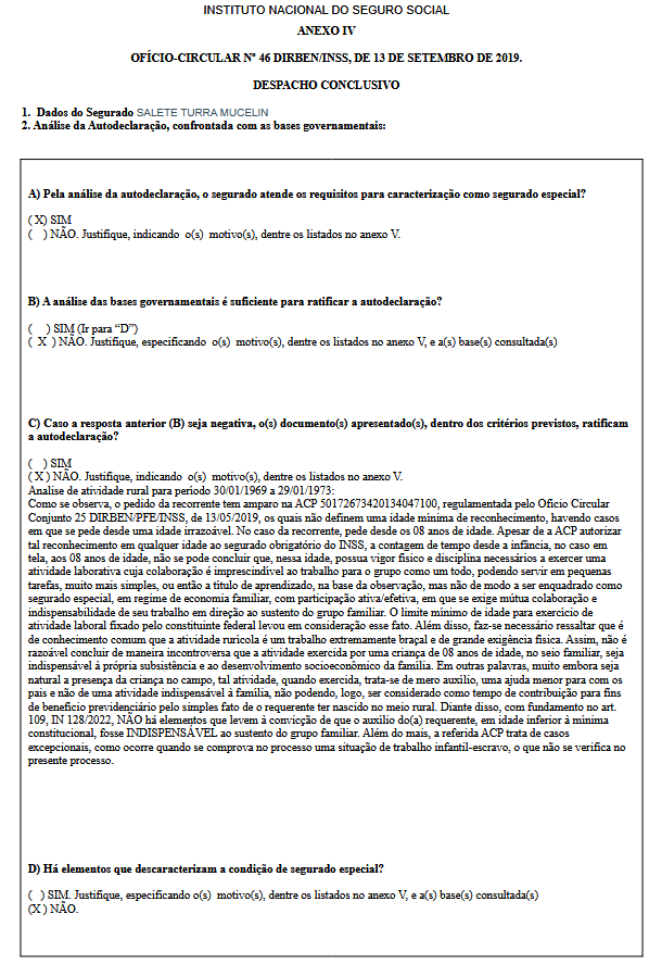 Analisando os autos verifico que o INSS recebeu o processo, via sistema eletrônico de recurso, em 23/10/2024, e o devolveu à 15ª Junta de Recursos, sem cumprimento da diligência, em 16/05/2025, em virtude de manifestação técnica da área responsável, que analisou os documentos apresentados à luz do Ofício-Circular n° 46 da Diretoria de Benefícios do INSS, e entendeu não comprovada a qualidade de segurada da autora no período: