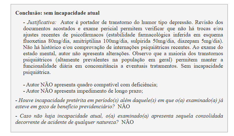 Em conclusão, a análise do conjunto probatório revela que, embora comprovada a condição da autora como portadora de moléstia associada a quadro depressivo – possivelmente resultante de eventos traumáticos –, inexistem, nos presentes autos, indicativos suficientes para atestar a incapacidade plena e efetiva para a participação social, em paridade de condições com os demais cidadãos. Tal conclusão é corroborada pelo fato de a recorrente estar submetida a tratamento psiquiátrico regular com a devida adesão a plano medicamentoso.