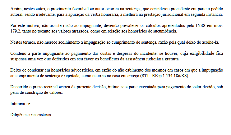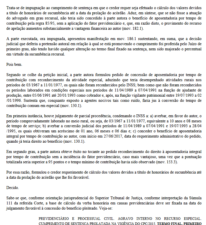 Dessa forma, considerando que foi dado provimento integral ao apelo da parte, afastando a incidência do fator previdenciário e concedeu benefício mais vantajoso à parte autora, parece-nos que houve alteração substancial no julgamento do apelo, devendo o acórdão ser o termo final a ser adotado (ev. 01, OUT4, fls. 51-52), amoldando-se ao teor da Súmula nº 111 do STJ (nesse sentido, a decisão monocrática do Ministro Benedito Gonçalves no RECURSO ESPECIAL Nº 1.419.016, 10-8-2017).