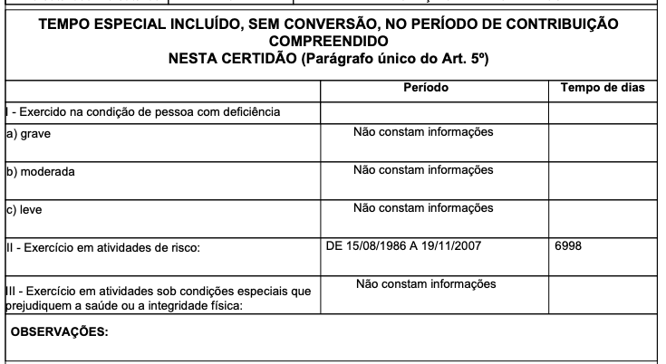 A CTC em questão não contém informação sobre o exercício de atividade em condições especiais, que prejudiquem a saúde ou a integridade física, mas possui informação do exercício de atividade de risco em campo específico (, p. 9/14).