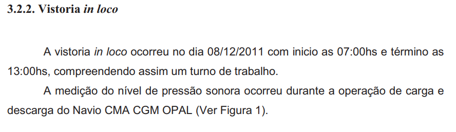 Naquela avaliação pericial, em um primeiro laudo, a vistoria in loco realizou a medição do nível de pressão sonora em uma embarcação (CMA CGM OPAL):