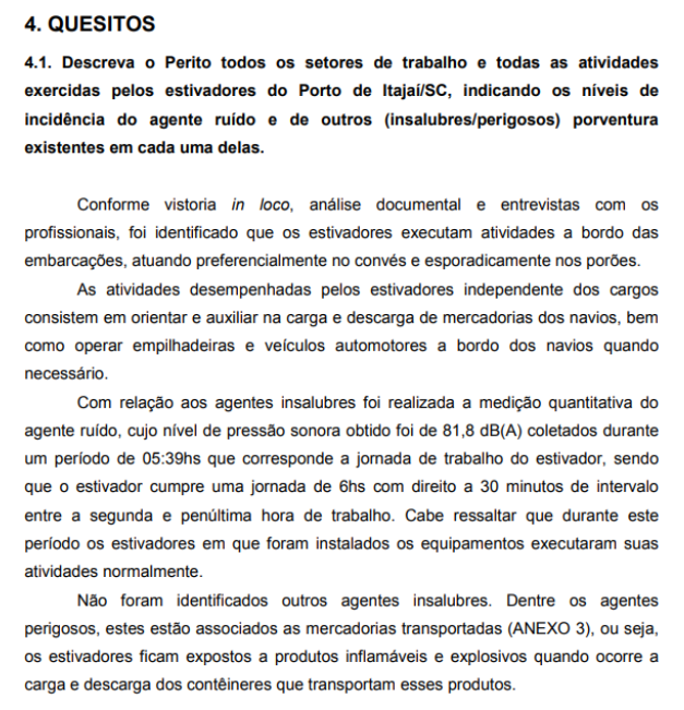 E essa conclusão não é afetada pela alegação de que em razão da destruição do cais do Porto de Itajaí ocorrido nos anos de 2008 e 2011, asseverando que se no período de 07/09/2011 a 01/04/2014 o Porto de Itajaí estava operando de forma parcial (33%), eis que, como já referido, os estivadores executam as suas atividades a bordo de embarcações, e na perícia judicial ora adotada como prova emprestada foi realizada a medição do nível de pressão sonora em três embarcações diferentes para se chegar a uma conclusão final consistente, no sentido de que os estivadores do Porto de Itajaí/SC estão expostos a níveis de ruído superiores a 80dB e inferiores a 85 dB: