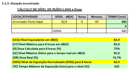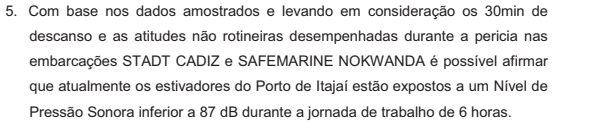 "Levando em consideração as três amostragens realizadas e as condições em que as mesmas ocorrem, concluo que a amostragem realizada no navio CMA CGM OPAL PE é a que melhor reflete a realidade dos estivadores do Porto de Itajaí. Sendo assim, é possível constatar que o nível de pressão sonora é superior a 80 dB e inferior a 85 dB" (grifei).
