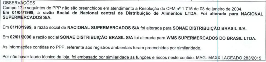 Analisando-se o PPP da empresa, verifica-se as avaliações ambientais foram preenchidas por similaridade, visto que não há laudo técnico da loja na qual o autor desempenhou suas atividades. Ainda assim, é possível utilizar as medições ambientais apresentadas, visto que realizadas em empresa do mesmo ramo e com funções que convergem com as atividades descritas no PPP.