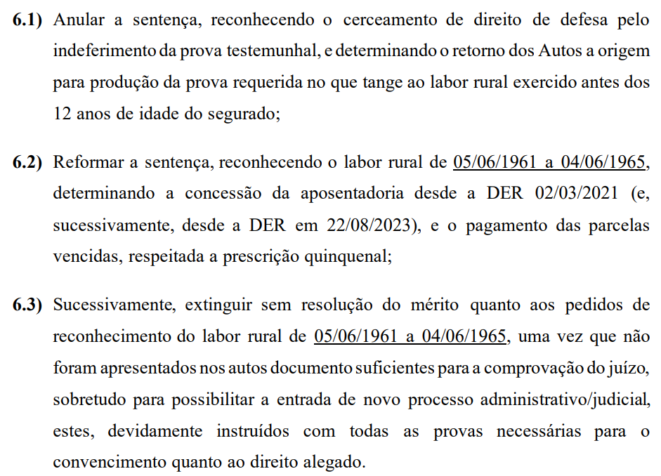 Assim, como no caso concreto não foi realizada audiência de inquirição de testemunhas para comprovar o labor campesino infantil, é de ser anulada a sentença e reaberta a instrução processual para a produção de prova oral do tempo rural abaixo dos doze anos.