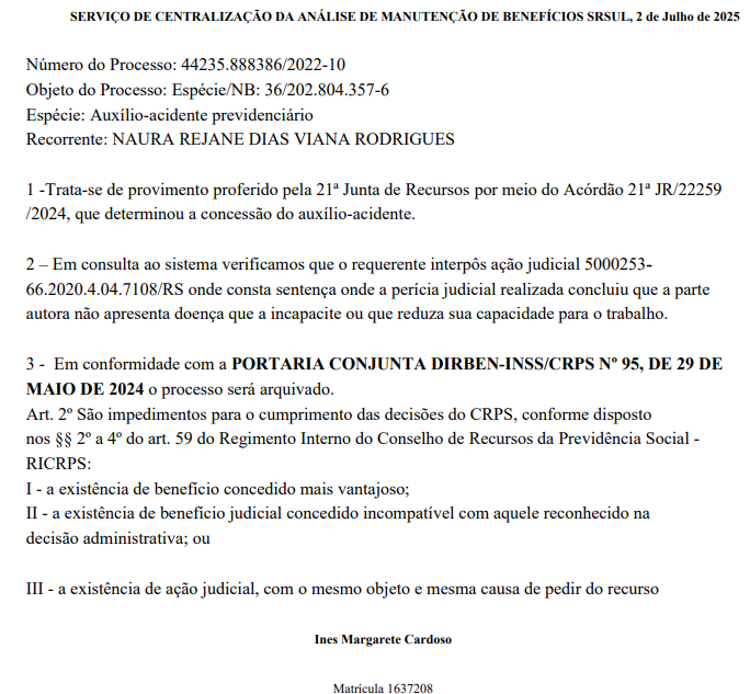 Ademais, esclarece que o processo judicial anterior (nº 5000253-66.2020.4.04.7108) tratava de pedido de auxílio-doença (NB: 630.714.090-2), enquanto este mandado de segurança visa a implantação do auxílio-acidente concedido em sede recursal administrativa. Acrescenta que a diferença entre objetos e registros impede a identidade de pedidos, ainda que ambos se refiram à "redução da capacidade laborativa". Entende que, para que a coisa julgada material ou a preclusão impedissem a implementação do acórdão administrativo, deveria haver prova robusta de identidade de pedido e causa de pedir, o que não é o caso dos autos. Destaca, por fim, que mandado de segurança busca a implantação de prestação já reconhecida administrativamente, e não a reanálise do conteúdo técnico-pericial que foi objeto do processo administrativo.