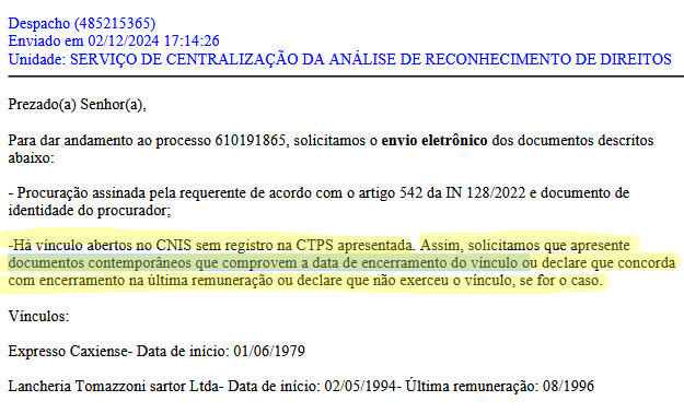 Com efeito, em 02/12/2024 foi formulada a seguinte exigência à segurada (, fls. 32):
