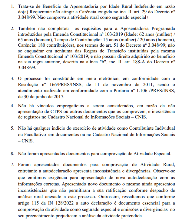 Da análise do processo administrativo, pode-se verificar que a Impetrante apresentou a autodeclaração, notas fiscais de produtor rural e outros documentos para comprovação da atividade rural/segurado especial, sendo que após a respectiva análise de mérito o pedido restou indeferido sob o motivo "do(a) Requerente não atingir a Carência exigida no inc. II, art. 29 do Decreto nº 3.048/99", bem como "da falta dos requisitos previstos na EC 103/2019 ou de direito adquirido ate 13/11/2019".