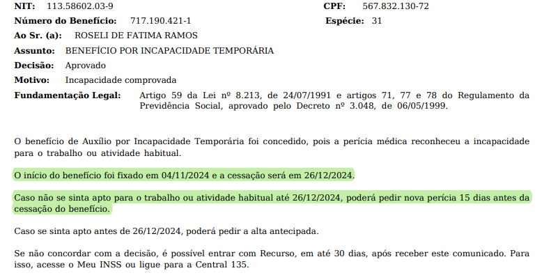 A impetrante formulou requerimento de prorrogação de benefício por incapacidade, em 04/11/2024 (), o que foi deferido em 14/02/2025, porém, com DCB anterior, em 26/12/2024 ().