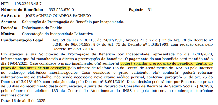 A parte impetrante comprovou ter obtido a concessão do benefício por incapacidade até 19/04/2025, sendo expressamente indicada a possibilidade de prorrogação do benefício, mediante solicitação formulada nos dias anteriores à cessação, sem definição de prazo ().
