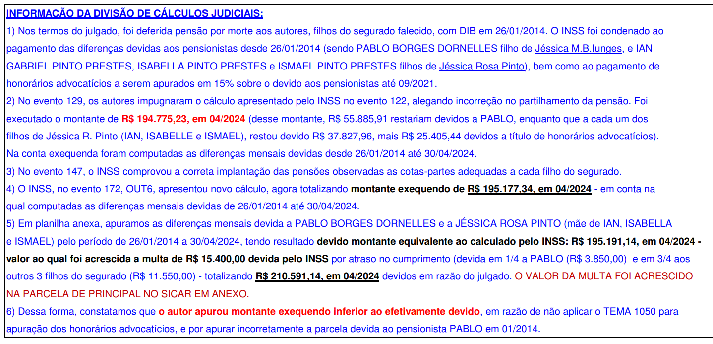 A parte exequente PABLO, requereu a retificação do cumprimento de sentença, em vista de equívoco que levou ao pagamento do benefício, em sua totalidade, ao núcleo familiar de IAN, ISMAEL e ISABELA. Além disso, ajuízou o presente cumprimento de sentença contra o INSS, pretendendo obter a cobrança de valores em atraso/diferenças decorrentes de concessão/revisão de benefício previdenciário determinada em ação de conhecimento, bem como honorários advocatícios da fase de conhecimento (). Apurou os seguintes valores em abril de 2024 ():