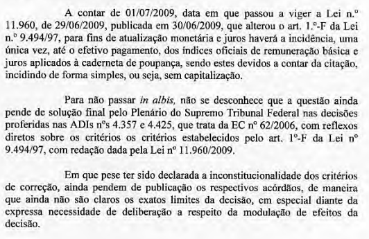 Este entendimento foi adotado porque, no momento do julgamento da fase de conhecimento, não havia definição da matéria no STF, com o que diferiu-se a definição dos critérios de correção monetária a serem aplicados para a fase de execução. A decisão final do STF quanto ao tema (RE 870.947) somente transitou em 03/03/2020.