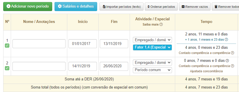 | 17 | - | 01/01/2017 | 13/11/2019 | 1.40 Especial | 2 anos, 11 meses e 0 dias + 1 anos, 1 meses e 23 dias = 4 anos, 0 meses e 23 dias | 35 |