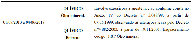 Aliás, já decidiu o STJ que "os óleos minerais são agentes químicos nocivos à saúde, enquadrados na subespécie Hidrocarbonetos e Outros Compostos de Carbono, independente de especificação sobre qual o tipo de óleo" (STJ, AgInt no AREsp 1204070/MG, Rel. Min. Francisco Falcão, 2ª T., j. 08.05.2018).