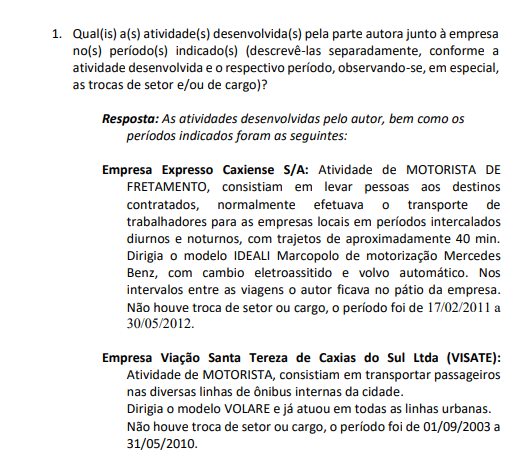 Ainda e segundo o perito, o laudo associado pelo segurado ao evento 39, realizado em Empresa diversa (Viação Montenegro) destoa dos modelos e do itinerário narrados pelo próprio autor.