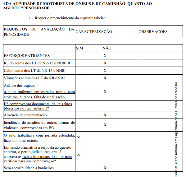 1. Análise do(s) veículo(s) efetivamente conduzido(s) pelo trabalhador. O perito deverá diligenciar junto à(s) empresa(s) empregadora(s) para descobrir a marca, o modelo e o ano de fabricação do(s) veículo(s) conduzido(s) e, de posse dessas informações, poderá analisar se existia ou não penosidade na atividade em razão da necessidade de realização de esforço fatigante, como, por exemplo, na condução do volante, na realização da troca das marchas, ou em outro procedimento objetivamente verificável. No caso dos motoristas de ônibus deverá ser averiguado se a posição do motor ficava junto à direção, ocasionando desconfortos ao trabalhador, como, por exemplo, vibrações, ruído e calor constantes (ainda que inferiores aos patamares exigidos para reconhecimento da insalubridade da atividade, mas elevados o suficiente para qualificar a atividade como penosa em virtude da constância da exposição), ou outro fator objetivamente verificável.