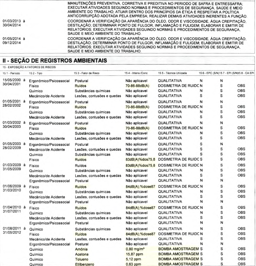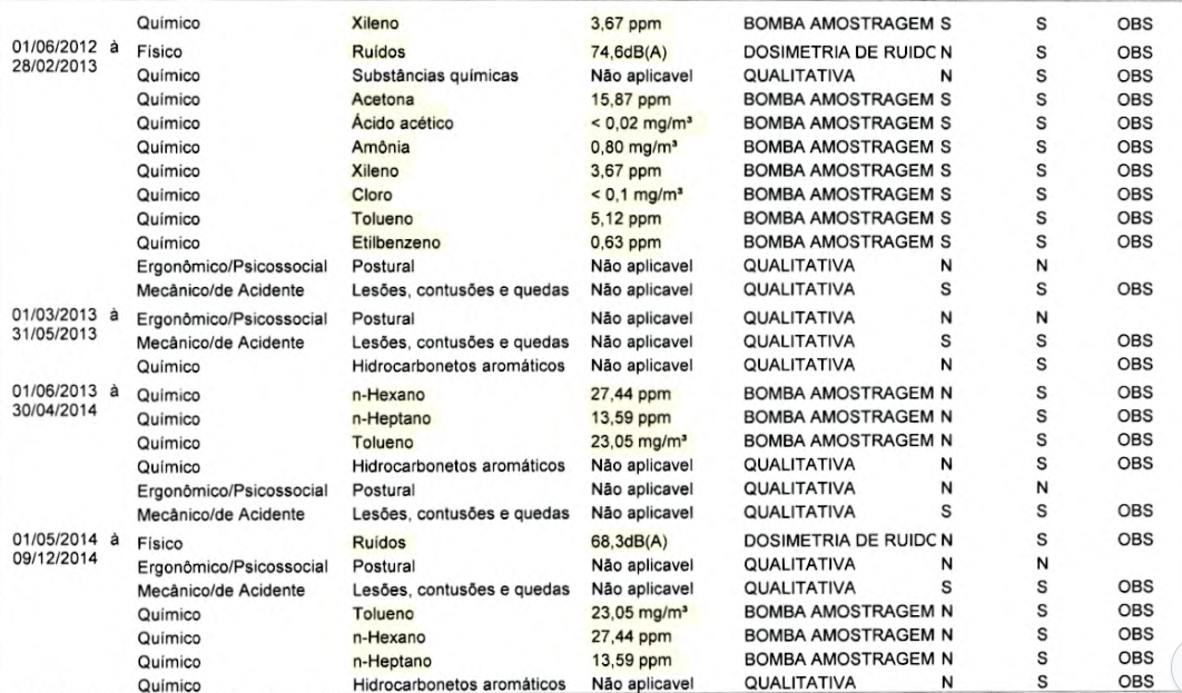 Os documentos técnicos também apontam a exposição hidrocarbonetos aromáticos, tais como o tolueno, etilbenzeno, xileno.