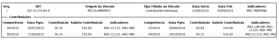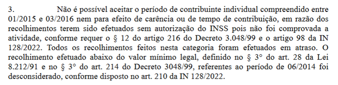 Como se lê, a questão reside na existência de contribuição anterior recolhida no prazo como contribuinte individual. O INSS deixou de computar o período, porque a contribuição anterior, de 06/2014, foi vertida abaixo do mínimo legal.