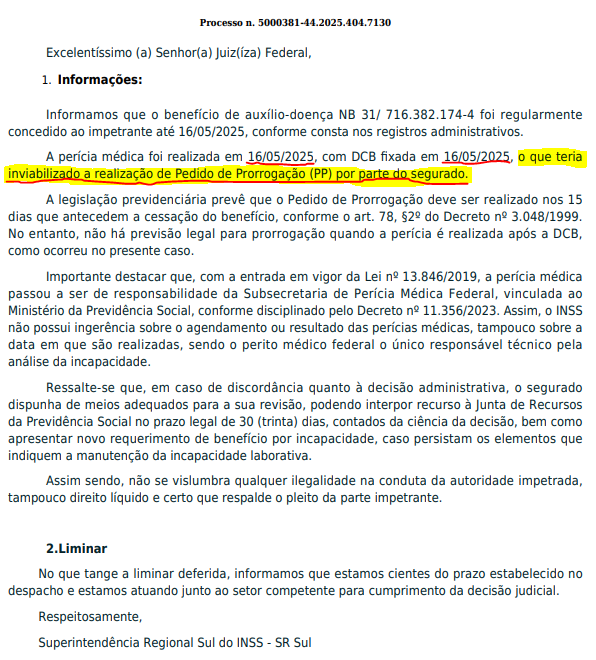 O impetrante formulou requerimento de prorrogação de benefício por incapacidade, em 17/01/2025 (), o que foi deferido em 19/05/2025 (), porém, com DCB anterior, em 16/05/2025.