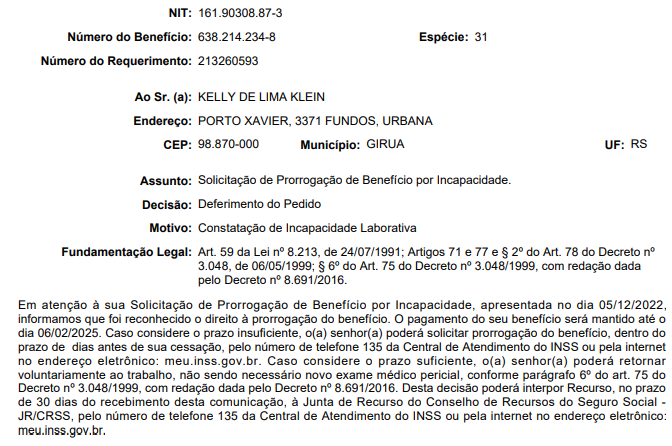 Observo, na decisão administrativa juntada pela impetrante, que houve a concessão da prorrogação do benefício até 06/02/2025 ():