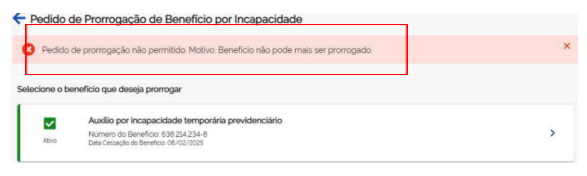 Já o impetrante refere que teve o auxílio por incapacidade temporária de NB 638.214.234-8 prorrogado pela Autarquia até 06/02/2025 (DCB). Entretanto, ao tentar realizar novo pedido de prorrogação, o portal do “Meu INSS” não permitiu o requerimento, sob argumento de que o benefício não podia mais ser prorrogado. Requereu seja determinado à autoridade impetrada que restabeleça/mantenha o benefício por incapacidade temporária da impetrante até nova avaliação médica, declarando ilegal a recusa no pedido de prorrogação