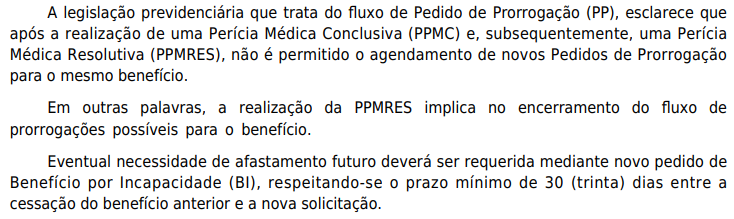 "Art. 388. Após as duas prorrogações automáticas, ou caso o prazo da agenda médica esteja com prazo inferior a 30 (trinta) dias, o segurado terá direito ainda a 2 (dois) pedidos de prorrogação que são o Pedido de Perícia Médica Conclusiva - PPMC e o Pedido de Perícia Médica Resolutiva - PPMRES, os quais passarão por perícia médica para delimitação da incapacidade e fixação do prazo de duração."