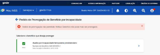Sustenta, em síntese, que não conseguiu realizar em tempo hábil o pedido de prorrogação do auxílio por incapacidade temporária de NB 640.369.659-2 por impedimento do sistema Meu INSS, que acusou como motivo "Benefício não pode mais ser prorrogado" (ev. 1.6 e 1.7).