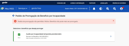 Pois bem. A prova juntada aos autos dá conta de tentativas de prorrogação de benefício (DCB em 11/01/2025) nas datas de 09/01/2025 e 10/01/2025 - E1 OUT6 e OUT7, adequadas ao prazo previsto na legislação previdenciária, que é dentro de 15 dias antes da nova DCB. No entanto, conforme mensagem, o "benefício não pode mais ser prorrogado".