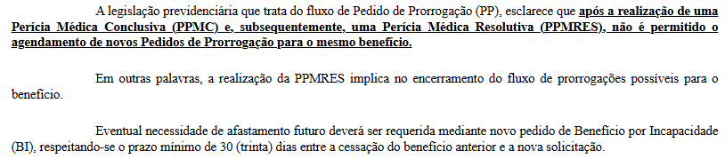 "Art. 388. Após as duas prorrogações automáticas, ou caso o prazo da agenda médica esteja com prazo inferior a 30 (trinta) dias, o segurado terá direito ainda a 2 (dois) pedidos de prorrogação que são o Pedido de Perícia Médica Conclusiva - PPMC e o Pedido de Perícia Médica Resolutiva - PPMRES, os quais passarão por perícia médica para delimitação da incapacidade e fixação do prazo de duração."