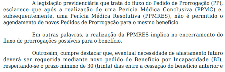 "Art. 388. Após as duas prorrogações automáticas, ou caso o prazo da agenda médica esteja com prazo inferior a 30 (trinta) dias, o segurado terá direito ainda a 2 (dois) pedidos de prorrogação que são o Pedido de Perícia Médica Conclusiva - PPMC e o Pedido de Perícia Médica Resolutiva - PPMRES, os quais passarão por perícia médica para delimitação da incapacidade e fixação do prazo de duração."