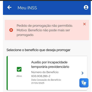 3. O pedido de prorrogação de benefício por incapacidade temporária é um direito do segurado e a impossibilidade de o segurado exercer esse direito pode ser objeto de mandado de segurança. Também a suspensão ou cancelamento não deve ocorrer antes de ser oportunizado o pedido de prorrogação.