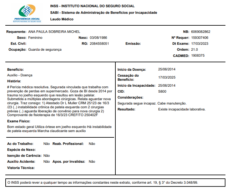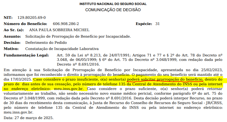 No caso dos autos, a impetrante teve o benefício prorrogado até 17/03/2025, conforme informação da Comunicação de Decisão em Solicitação de Prorrogação (evento 01- OFÍCIO_C5). Tal DCB foi fixada em perícia médica resolutiva, como se observa do Laudo juntado (evento 01, LAUDOPERIC3).