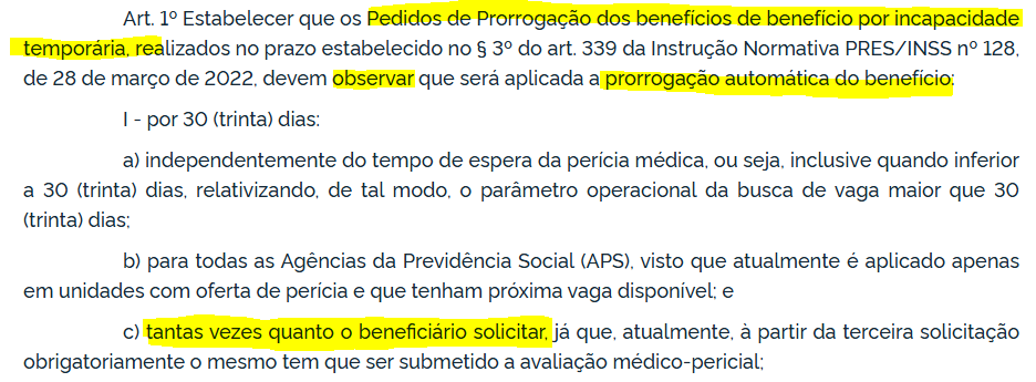 "Art. 388. Após as duas prorrogações automáticas, ou caso o prazo da agenda médica esteja com prazo inferior a 30 (trinta) dias, o segurado terá direito ainda a 2 (dois) pedidos de prorrogação que são o Pedido de Perícia Médica Conclusiva - PPMC e o Pedido de Perícia Médica Resolutiva - PPMRES, os quais passarão por perícia médica para delimitação da incapacidade e fixação do prazo de duração."