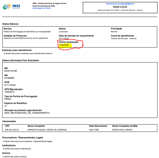 "A Impetratante protocolou pedido de prorrogação de benefício por incapacidade nº 6429134788 em 04 de novembro de 2024 junto à Autoridade Coatora, eis que não tem condições de exercer a sua atividade como artesã, estando acometida e em tratamento para alterações degenerativas de mãos e punhos direitos e esquerdos, rizartrose importante nas mãos, artrose entre o primeiro metacarpo com o trapézio, apresentando dor incapacitante e perda de