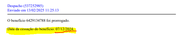 O impetrado prestou informações esclarecendo que o benefício foi prorrogado até 07/12/2024, mas que, devido a uma falha nos sistemas corporativos, só foi concluído pela rotina de automação em 13/02/2025.