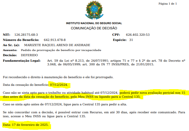 força, déficit da pinça com dificuldade para pegar objetos (CID M18.9 , M 62.4), além de tendinose no ombro direito. Seu pedido foi analisado pela Autoridade Coatora em 13 de fevereiro de 2025, prorrogando o benefício da Impetrante para 07 de dezembro de 2024. Ocorre que a Impetrante ficou prejudicada, eis que não foi possível solicitar uma nova avaliação pericial no prazo de 15 dias antes da data da cessação do benefício, uma vez que a Autoridade Coatora determinou a prorrogação em 13 de fevereiro de 2025, mas com data de cessação retroativa, em 07 de dezembro de 2024, fazendo com a Impetrante tivesse um prejuízo de mais de 2 meses de recebimento de salário de benefício, eis que, mesmo que fizesse um novo pedido na data em que teve conhecimento, o novo benefício seria pago somente a partir daquela data."