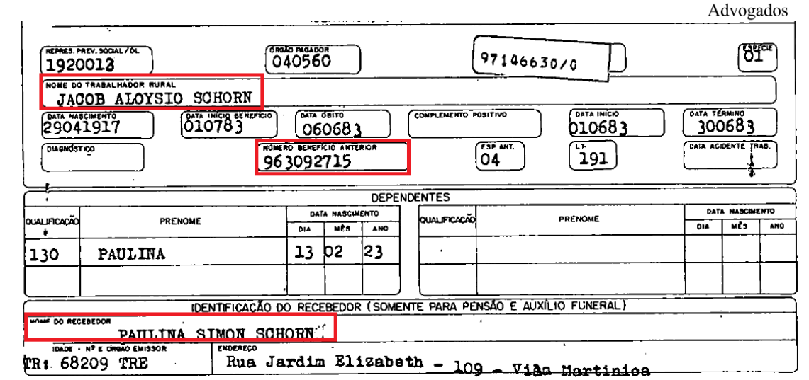 Sem embargo, a curadora da autora afirma, em apelação, que posteriormente a prolação da sentença, encontrara cópia do processo administrativo que concedeu a pensão por morte da mãe, senhora Paulina, decorrente do óbito do genitor, como segue: