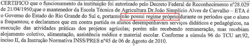 No caso sob exame, verifica-se que, conforme a própria documentação anexada aos autos, notadamente a certidão emitida pela Escola Técnica de Agricultura Dr. João Simplicio Alves de Carvalho, atesta que a instituição era mantida pelo Governo do Estado do Rio Grande do Sul e que, durante o período em que o autor a frequentou, não possuía regime próprio (evento 21, DECL2). Confira-se: