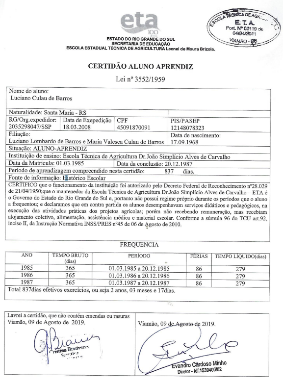 No caso, para comprovar o tempo de serviço na condição de aluno-aprendiz, foi juntada "Certidão Aluno Aprendiz" (evento 21, DECL2, p. 1), em que consta que o autor frequentou a Escola Técnica de Agricultura (ETA) Dr. João Simplício Alves de Carvalho, nos períodos de 01/03/1985 a 20/12/1985, 01/03/1986 a 20/12/1986 e 01/03/1987 a 20/12/1987.
