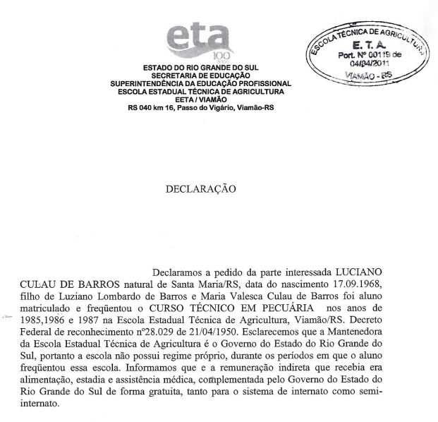 Observa-se que também foi juntada declaração da instituição, em que consta que o autor frequentou o Curso Técnico em Pecuária, sendo que "a remuneração indireta que recebia era alimentação, estadia e assistência médica, complementada pelo Governo do Estado do Rio Grande do Sul de forma gratuita, tanto para o sistema de internato como semi-internato." (evento 21, DECL1, p. 2). Nesse sentido, apresenta-se o seguinte excerto (evento 21, DECL1, p. 2):