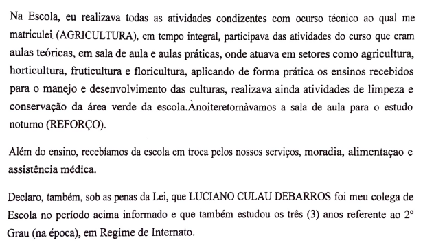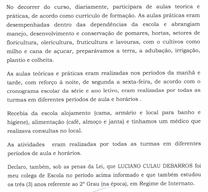 Consta, expressamente, nesse documento, que "os alunos desempenhavam serviços didáticos e pedagógicos, na execução das atividades práticas dos projetos agrícolas; porém não recebendo remuneração, mas recebiam alojamento coletivo, alimentação, assistência médica e material escolar. Conforme a súmula 96 do TCU art.92, inciso II, da Instrução Normativa INSS/PRES nº45 de 06 de Agosto de 2010." (evento 21, DECL2, p. 1). Por oportuno, apresenta-se excerto desse documento (evento 21, DECL2, p. 1):