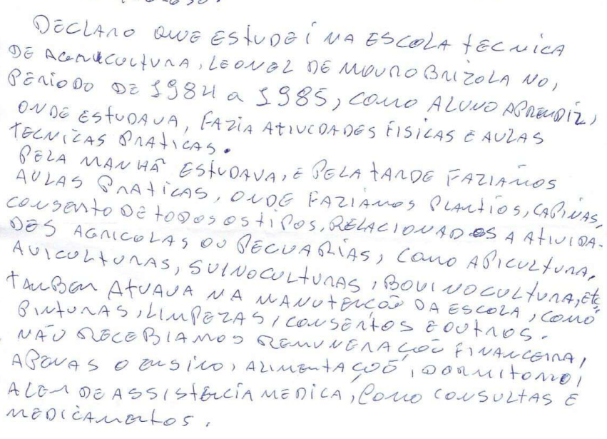 As declarações escritas firmadas por testemunhas confirmam o teor da certidão emitida pela instituição de ensino no sentido de que não havia remuneração, mas fornecimento de alimentação, moradia e materiais didáticos (evento 56). Ademais, observa-se que as testemunhas também registram que eram realizadas atividades práticas relacionadas com o curso técnico. A título de exemplo, apresentam-se os seguintes excertos: