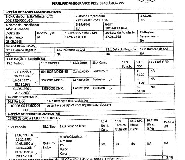 Nesse contexto, está demonstrada a especialidade do período de 17/03/1995 a 26/12/1996, trabalhado na empresa Zatt Construções, na função de pedreiro em razão da exposição a cimento (álcalis cáusticos), conforme indicado no PPP apresentado no evento 2, OUT3, p. 29.