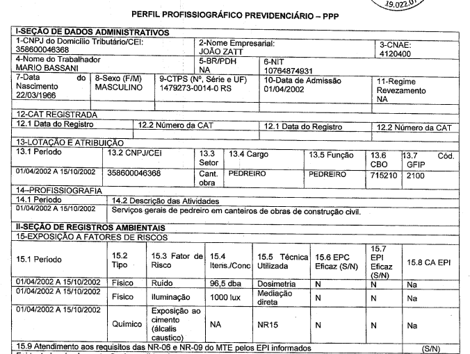 Nesse contexto, está demonstrada a especialidade do período de 1º/04/2002 a 15/10/2002, trabalhado para o empregador João Zatt, na função de pedreiro em razão da exposição a cimento (álcalis cáusticos), conforme indicado no PPP apresentado no evento 2, OUT5, p. 1