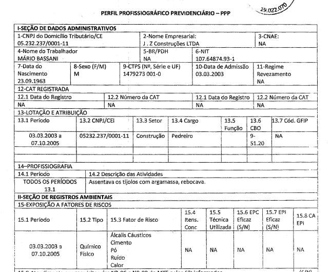 Nesse contexto, está demonstrada a especialidade do período de 03/03/2003 a 07/10/2005, trabalhado na empresa J/Z Construções, na função de pedreiro em razão da exposição a cimento (álcalis cáusticos), conforme indicado no PPP apresentado no evento 2, OUT4, p. 23