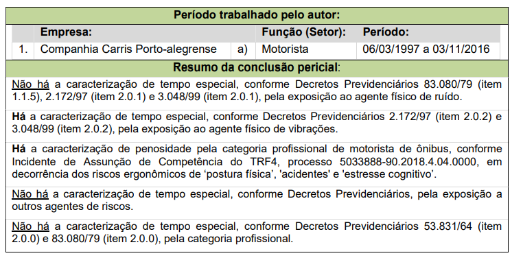 Nesse contexo, está demonstrada a especialidade do período de 06/03/1997 a 03/11/2016, trabalhado na empresa Companhia Carris Porto Alegrense, na função de Motorista Horista, em razão da exposição à penosidade, conforme indicado nos laudo periciais juntados no evento 28, LAUDO1 e evento 72, LAUDOPERIC1.
