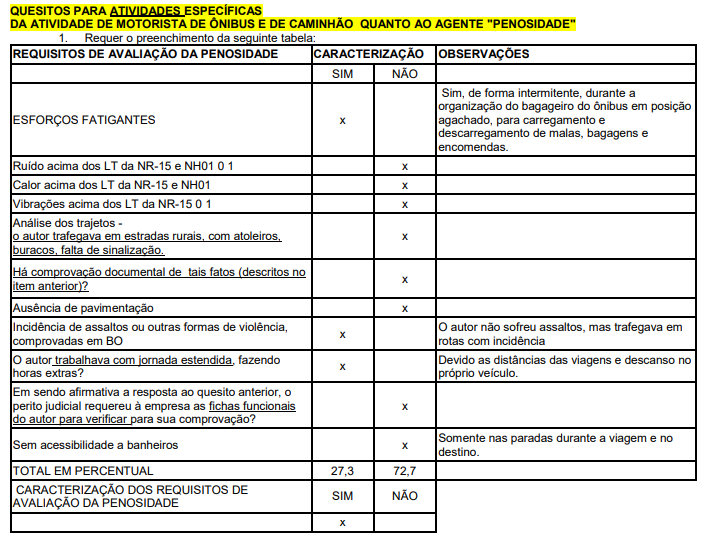 No julgamento deste IAC, no que diz respeito à penosidade das atividades de motorista de ônibus, foram estabelecidos critérios para avaliação da penosidade: